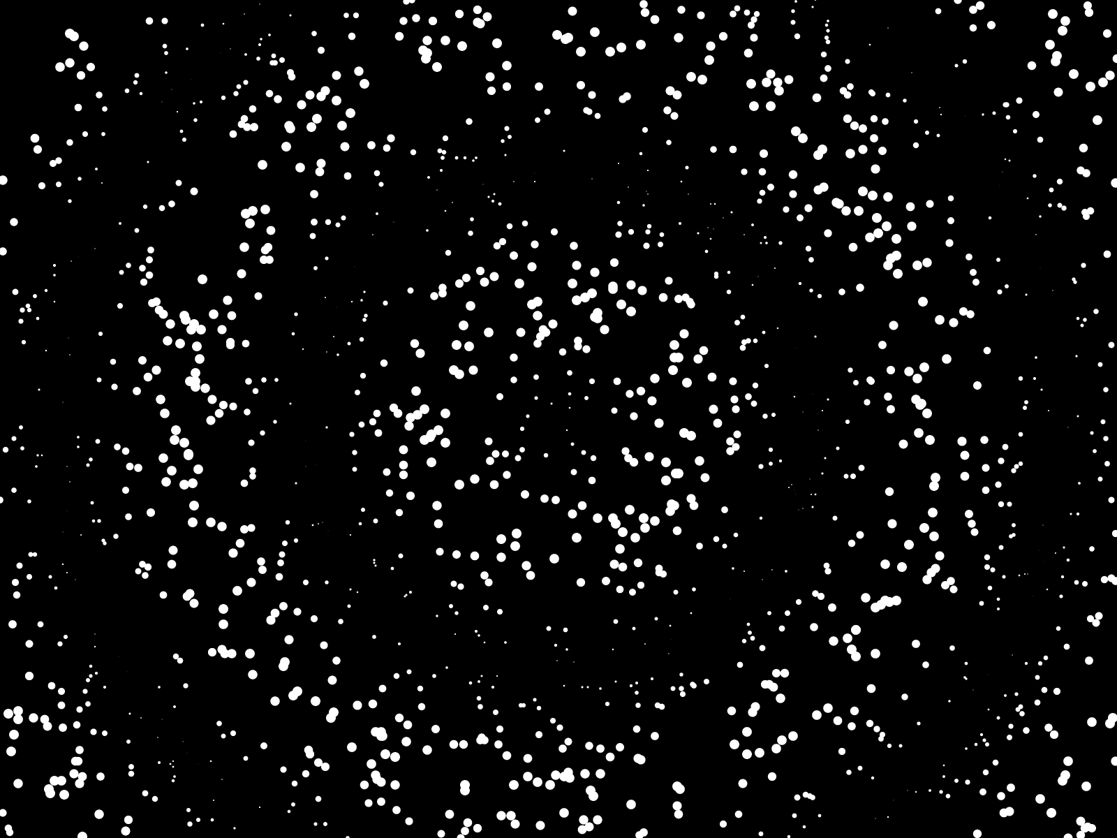 A myriad of white circles whose size is function of a sinus. By simultaneously representing dots and waves, this composition evokes the concept of wave-particle duality. Projecting the dots at random locations emulates a form of digital action-painting. [Code]