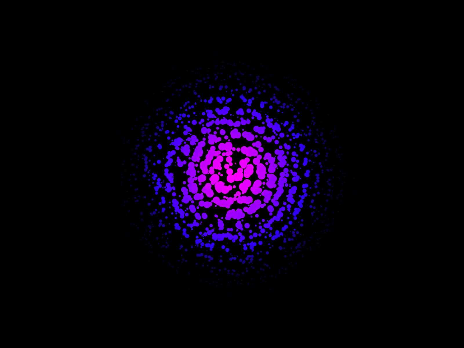 A multitude of random circles aggregates to form an organic structure. Size and color are function of distance from the center. I envision this as the spontaneous emergence of consciousness in the brain. [Code]