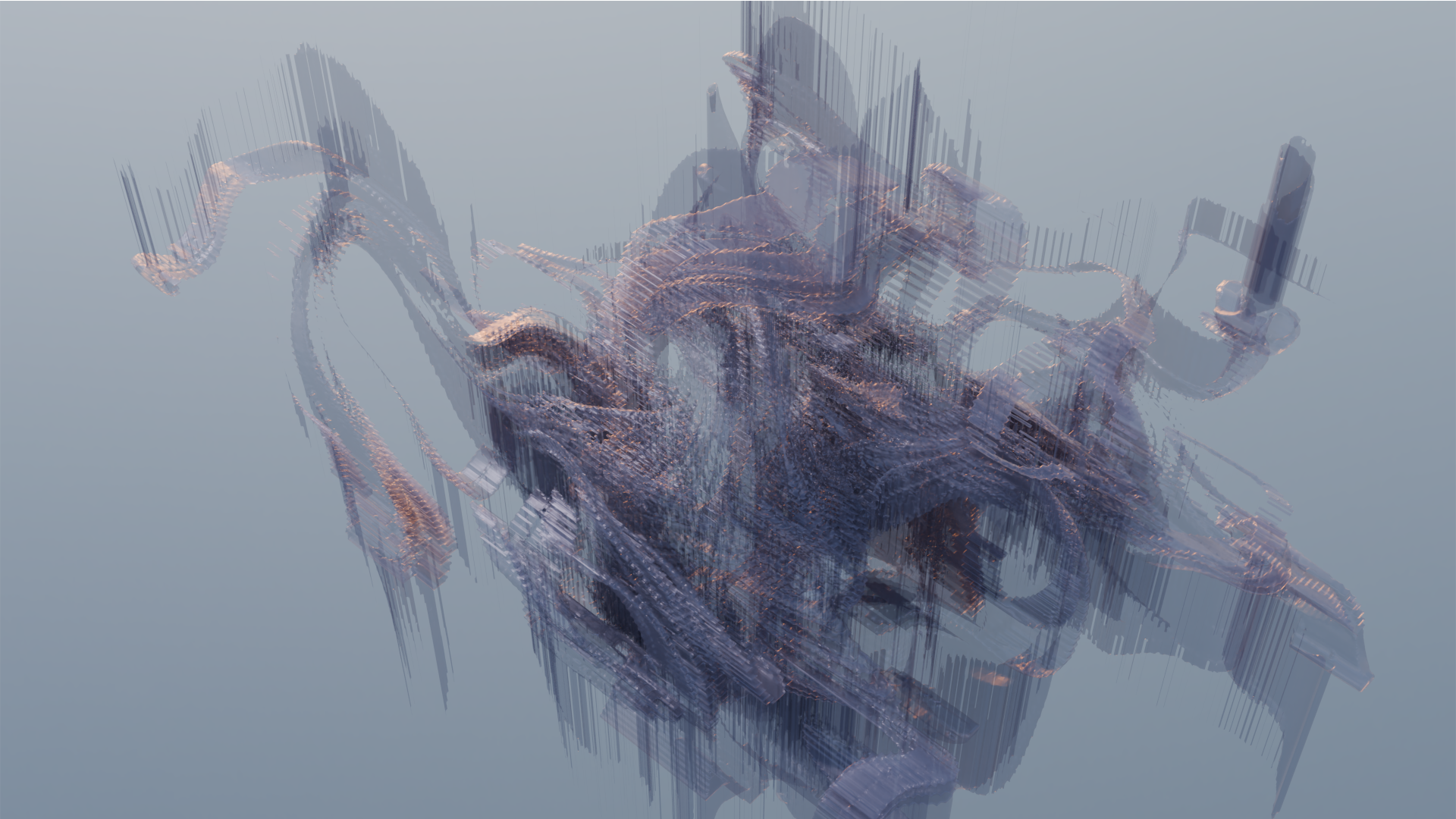 In this project I generate a 3D organic form using procedural modeling, then render selected 2D views with different lighting and materials. I am mostly interested in the 2D abstract textures I can generate from this process rather than the 3D sculpture itself. This is the outcome of an online class given by Chantal Matar from Zaha Hadid Architects [13].